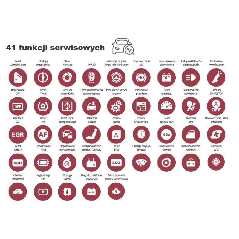 Urządzenie zapewnia pełną obsługę 41 funkcji serwisowych, w tym kalibracje, aktywacje komponentów i kodowania, a także umożliwia darmowe programowanie sterowników dla wiodących producentów: Renault, Subaru, Land Rover, Nissan, Kia, Hyundai, grupa VAG, Mercedes-Benz, BMW, Porsche, Maxus, MG.